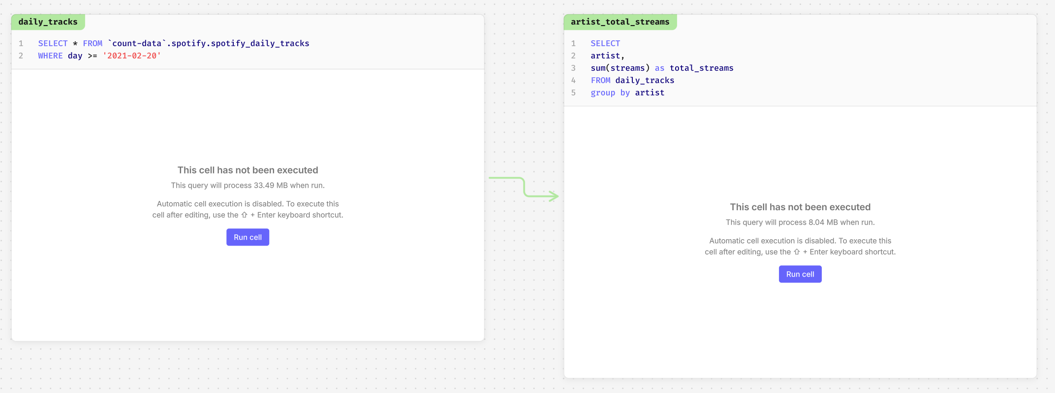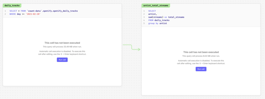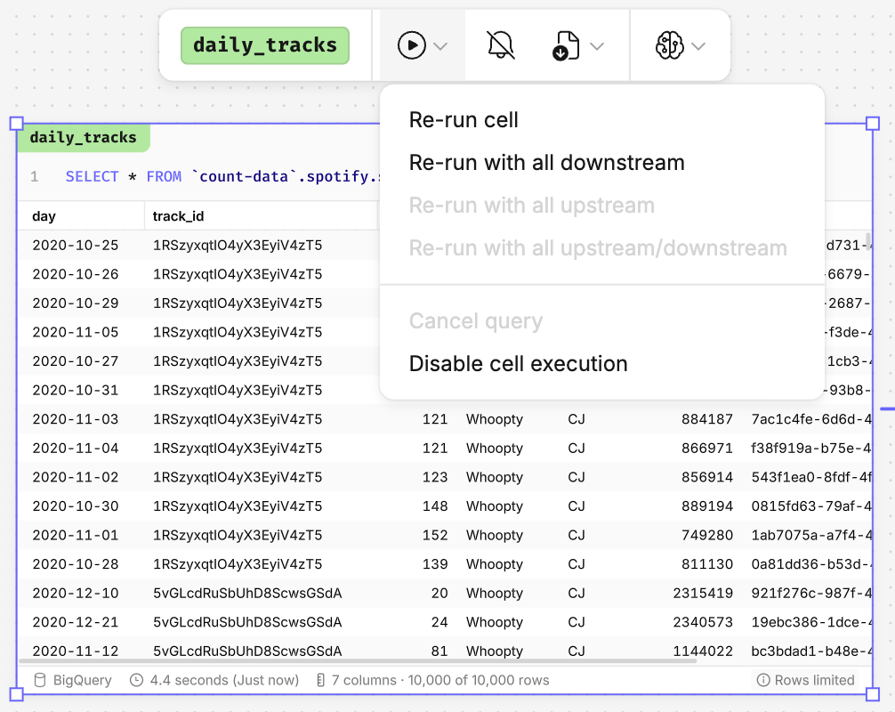 - Individual cells - exercise more granular control and limit larger cells running every time by disabling individual cell execution, with all downstream cells still executing independently.