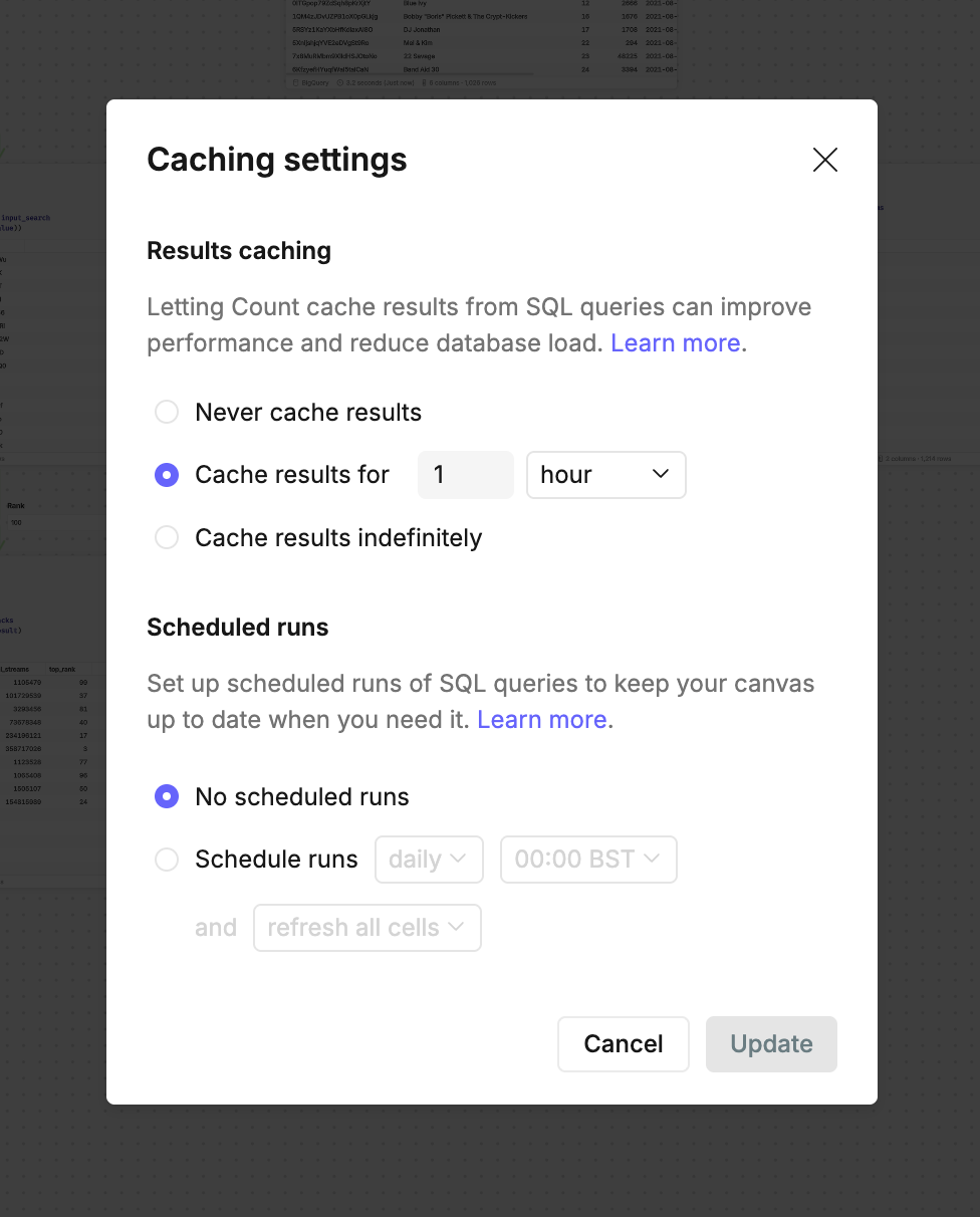 - Cache indefinitely - most efficient option where queries only rerun when you edit cells or manually execute them.