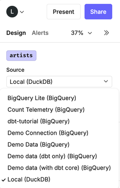 - DuckDB in the browser - convert database cells to local browser cells for fast performance (limited by 120MB memory).
