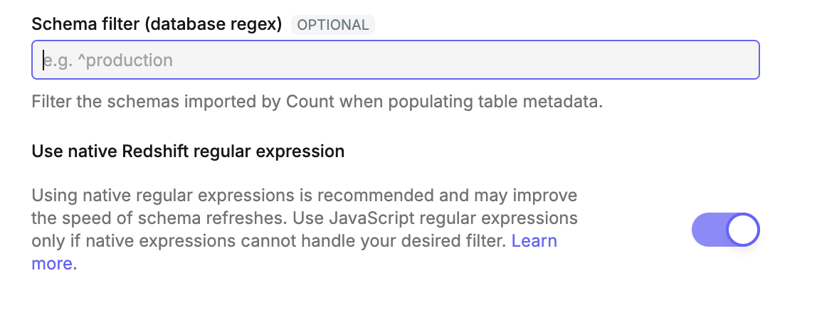 - Javascript regular expression. This regular expression is applied to the schema of each row of table metadata streamed to Count's servers. For example, to only fetch schema that begin with the text "production", the filter should be