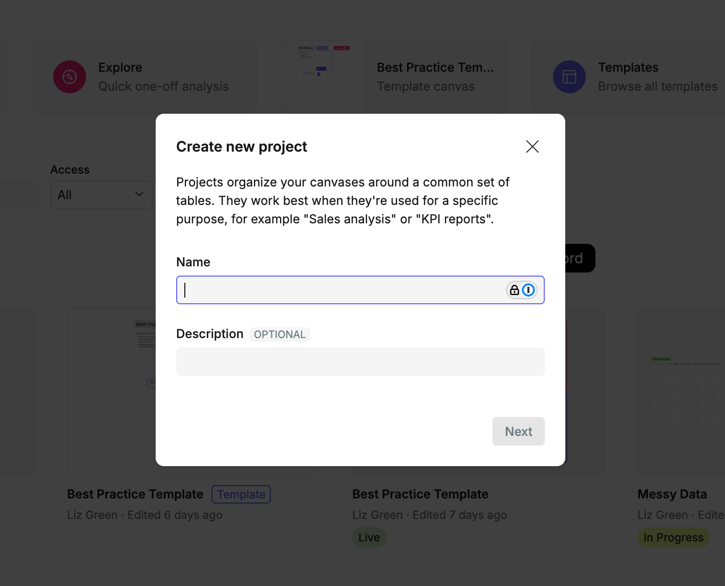 5. Create projects - projects are spaces to help organise your canvases. You can use naming hierarchies to group canvases methodically and organise them into the right space. This could include projects for individual, department / initiative, and company-wide work.