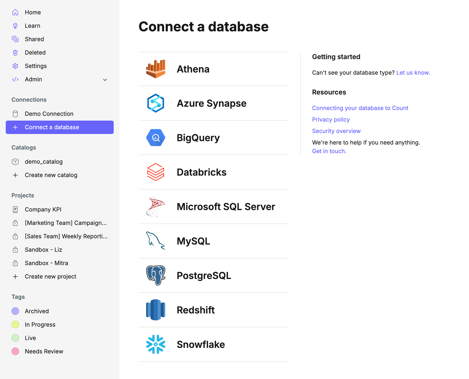 4. Connect your data sources - you can connect to multiple datatypes and even define and manage metrics with Count's semantic layer.