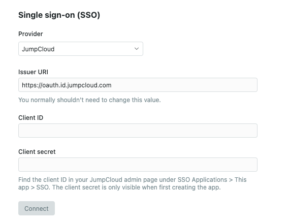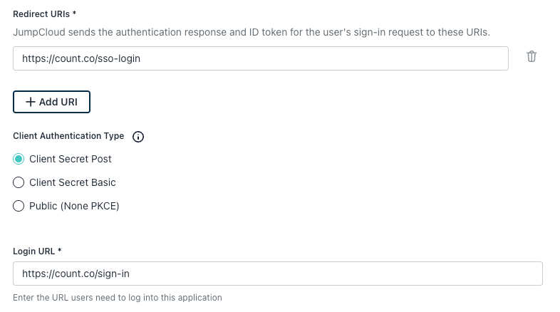 Head to the Count workspace settings, select the SSO tab and select JumpCloud - you'll need to provide a Client ID and Client secret.