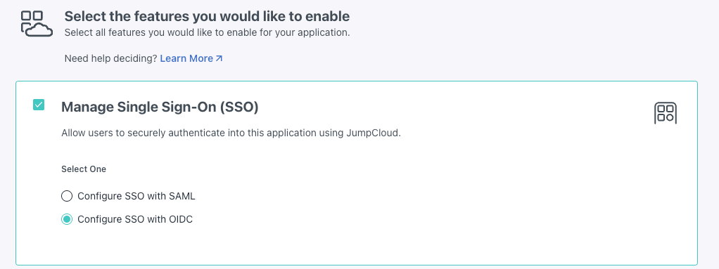 When choosing features to enable, ensure that Configure SSO with OIDC is selected: