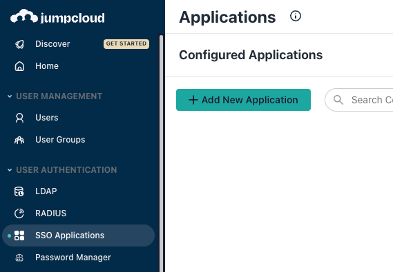 In the JumpCloud admin dashboard, under User authentication > SSO Applications, select Add New Application then Custom Application: